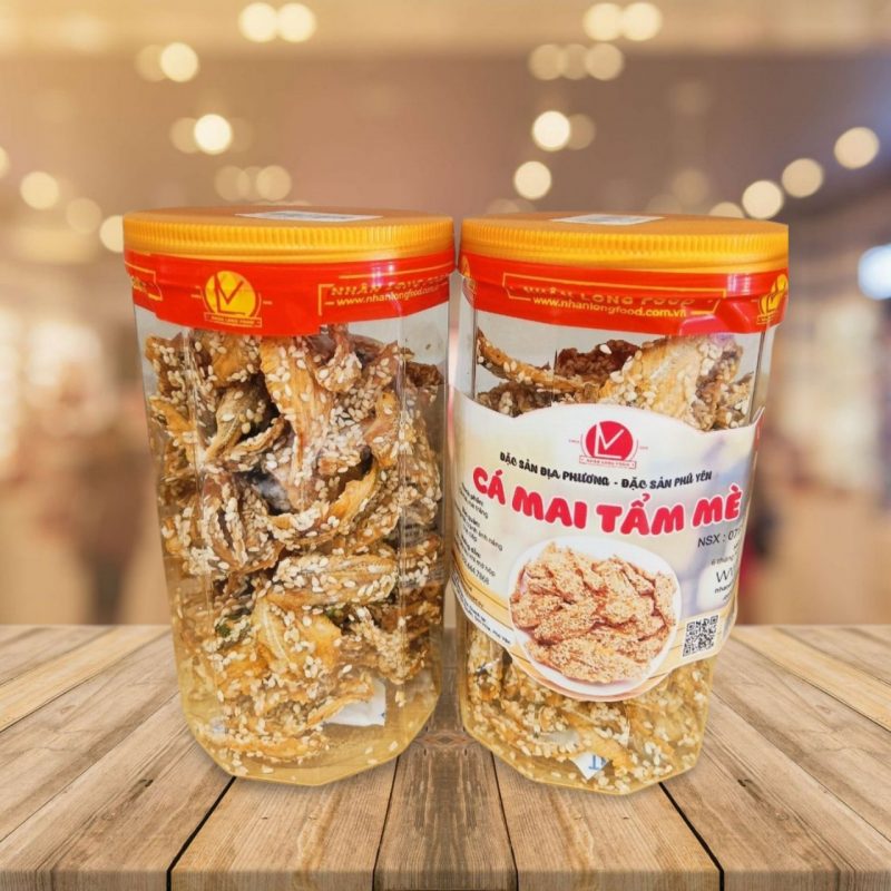 Cá mai tẩm mè là loại cá mai ngon được sấy khô, sau đó được tẩm ướp cùng gia vị và mè trắng để chế biến món cá mai tẩm mè ngon giòn, hấp dẫn. Không chứa chất bảo quản, đường hóa học, chất tạo hương, tạo màu trong sản phẩm.